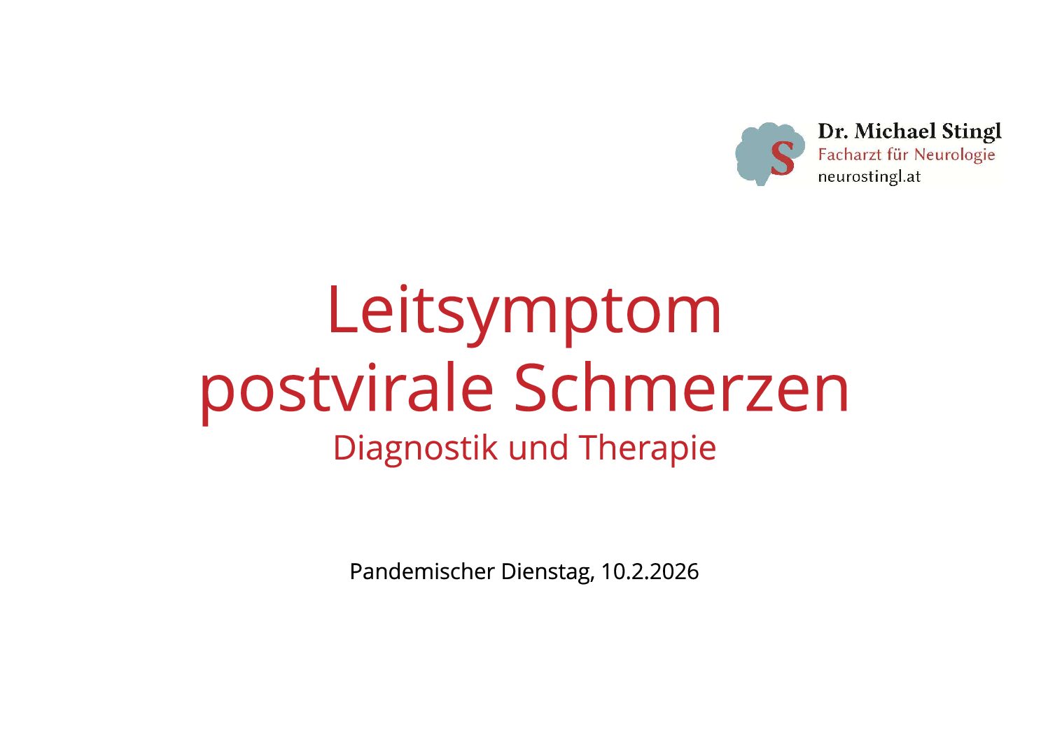 Fr. Michael Stingl, ausgewiesener Facharzt für das Thema postinfektiöse/-virale Krankheiten, hat in der Reihe „pandemischer Dienstag“, welcher regelmässig von der Wiener Ärztekammer organisiert wird, einen Vortrag zum Thema „Leitsymptom postvirale Schmerzen – Diagnostik und Therapie“ gehalten. Darin zeigt er die wichtigsten diagnostischen Merkmale zur Erkennung von postviralen Erkankungen auf. Ausserdem werden Behandlungsmöglichkeiten aufgezeigt. (Die im Vortrag genannten Medikamente dürfen ausschließlich nach Rücksprache mit dem Hausarzt eingenommen werden. Eine eigenständige Einnahme ohne ärztliche Abstimmung ist ausdrücklich nicht gestattet.)